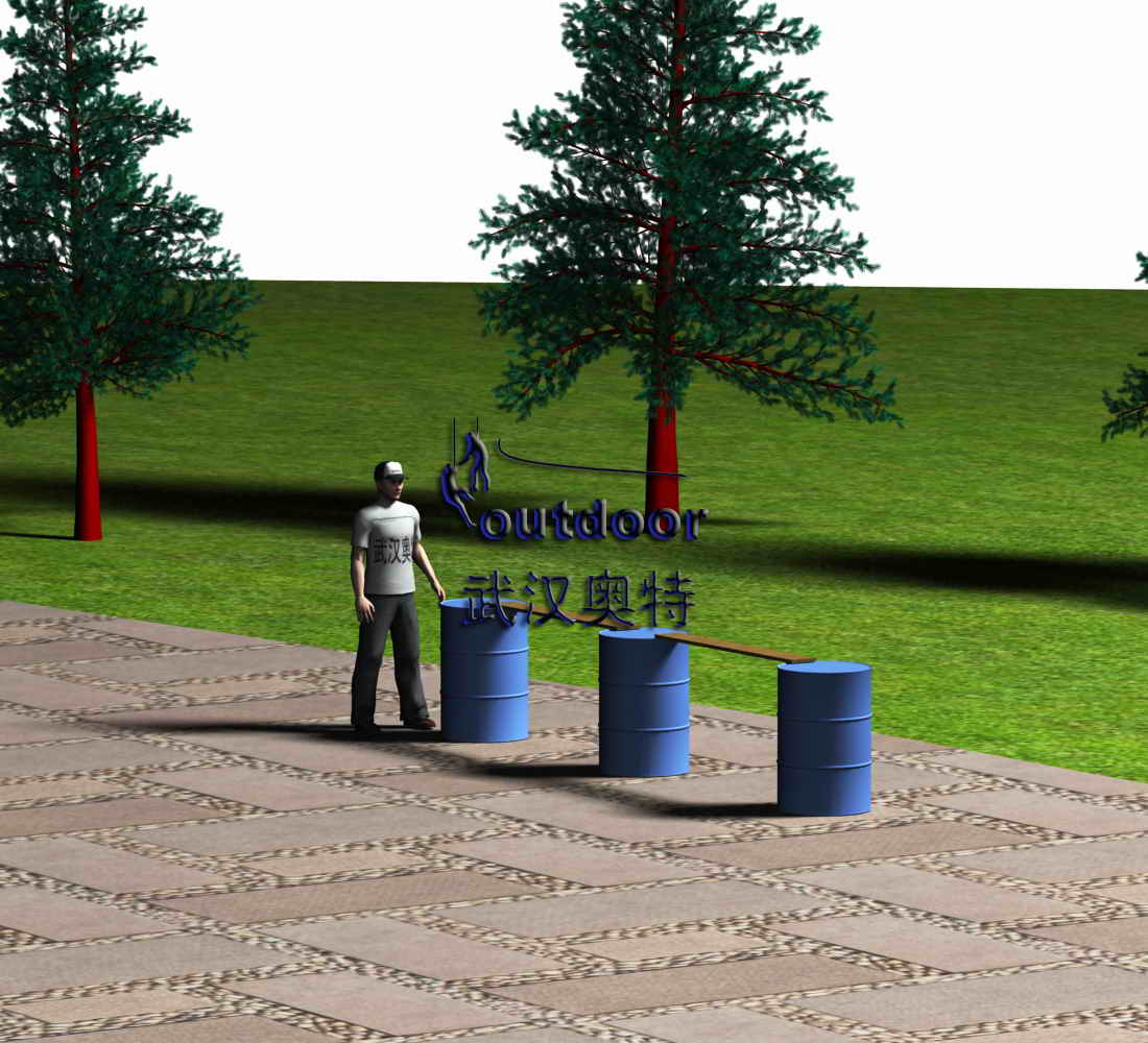 1、利用3只桶和2塊窄板,所有隊員站在桶和板上,移動20米的距離。