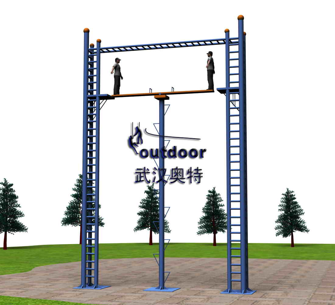拓展設施產品介紹:在9米高空有一座需要雙人配合穿越的天平橋板,想嘗試嗎?