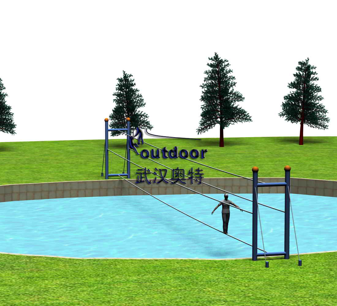 拓展設(shè)施產(chǎn)品介紹:參與者腳踩鋼纜,雙手扶著保護繩,穿越水上簡易的橋面