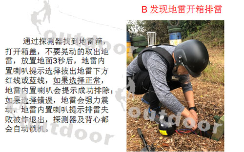 將團隊分組,教官活動前制定任務卡,由各組抽簽決定任務內容,任務的結果都埋藏在場地中的藏寶盒。在找尋藏寶盒過程中,隊員通過手中探雷器避開地雷。在規定時間內完成任務卡上交辦事情的隊伍獲勝。
